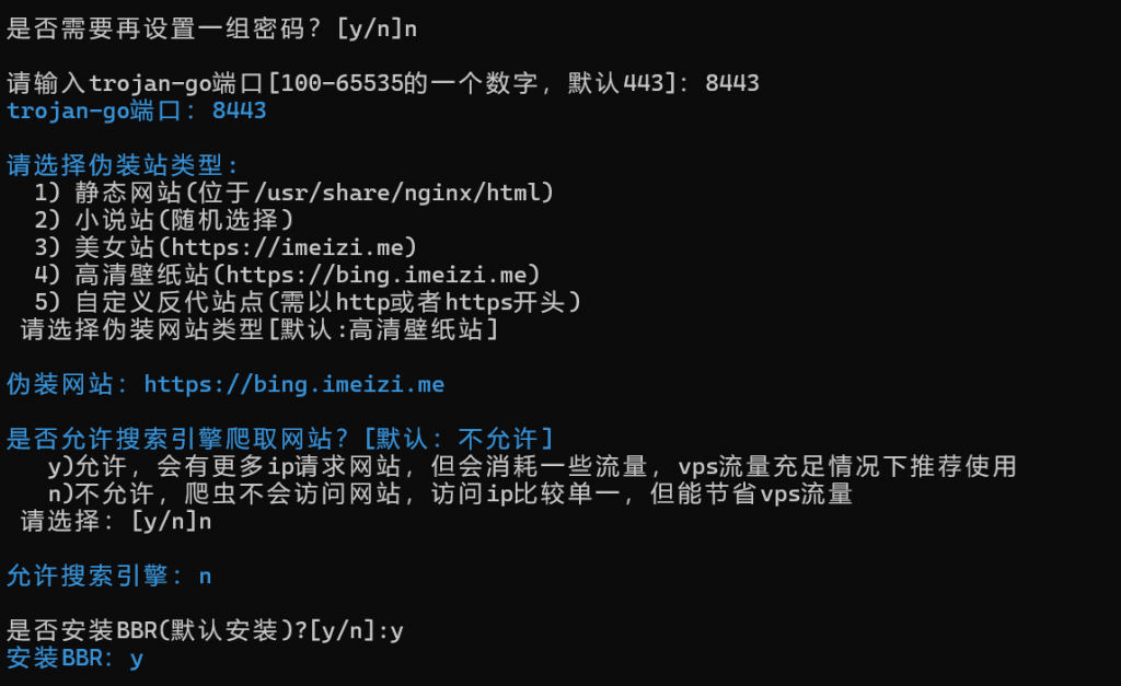 第一次安装输入“1”,然后输入“y”继续,依次按照提示输入伪装域名、密码。到了端口这里,如果你要搭建博客,应避免占用 443 或 80 端口,不然后期会出问题,推荐选择 8443。后面伪装站、禁用搜索引擎抓取任意,开启 BBR 加速。之后安装过程中一直回车就可以。