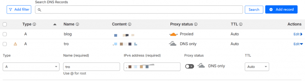 购买完成后,选择一家 DNS 解析服务商,这里以 Cloudflare 为例,在 Domains -> 选中你的域名 -> DNS -> Records 中添加记录,用 tro 作伪装域名, blog 作博客域名,则配置如下图: