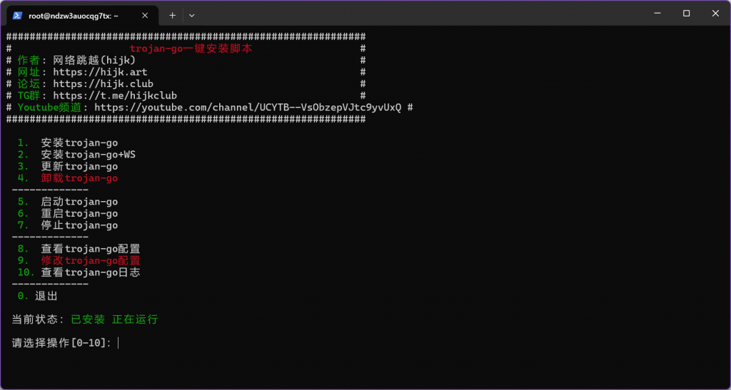 接下来就可以进入部署阶段。在服务器执行一键部署 Trojan-go 的脚本: