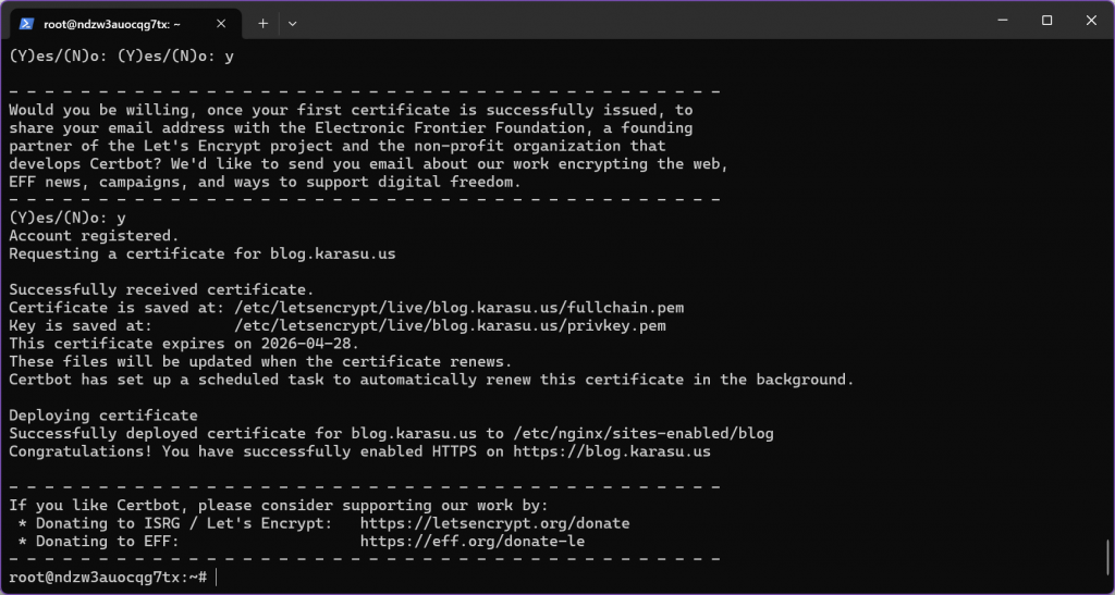 期间需要填一个邮箱以便提醒证书过期、同意服务条款等,完成后应出现“Congratulations! You have successfully enabled HTTPS on https://博客域名”,如图